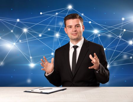 Young handsome businessman sitting at a desk with a blue connection graphic behnid him