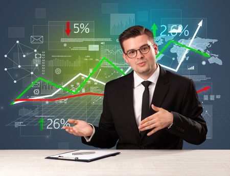 Young handsome businessman sitting at a desk with stocks and progress charts behind him
