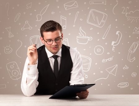 Young handsome businessman sitting at a desk with white mixed media icons behind him