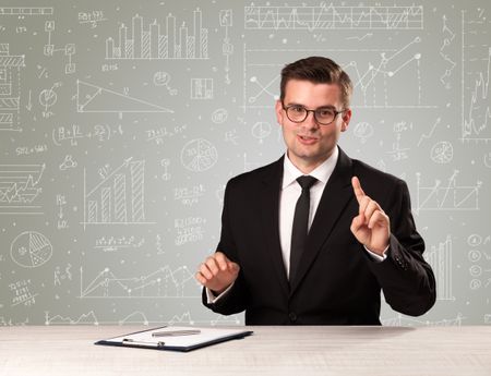 Young handsome businessman sitting at a desk with white graphs and calculations behind him