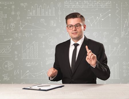 Young handsome businessman sitting at a desk with white graphs and calculations behind him
