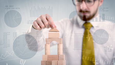 Young handsome businessman using wooden building blocks with data and numbers around him