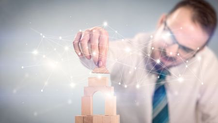 Young handsome businessman using wooden building blocks with interconnected lines and dots around him