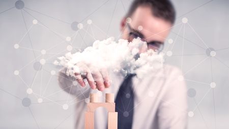 Young handsome businessman using wooden building blocks behind cloud concept