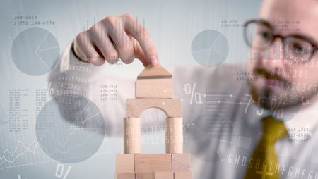 Young handsome businessman using wooden building blocks with data and numbers around him