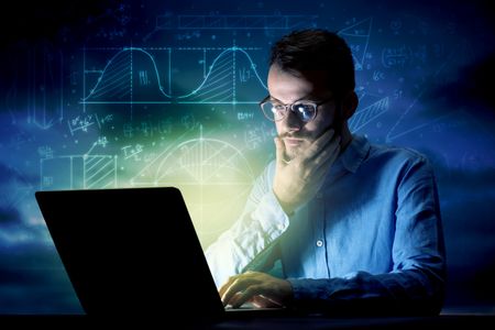 Young handsome businessman working late at night in the office with blue mathematic charts in the background