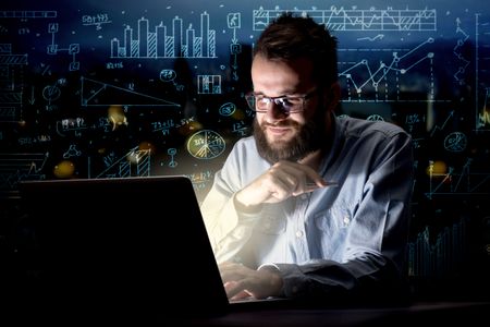 Young handsome businessman working late at night in the office with blue calculations in the background