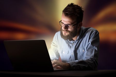 Young handsome businessman working late at night in the office with warm lights in the background
