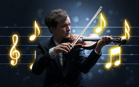 Young handsome fiddler playing with music sheet background