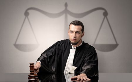 Young handsome judge in black gown making decision