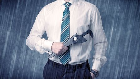 Young handsome man holding tool with raindrop graphic