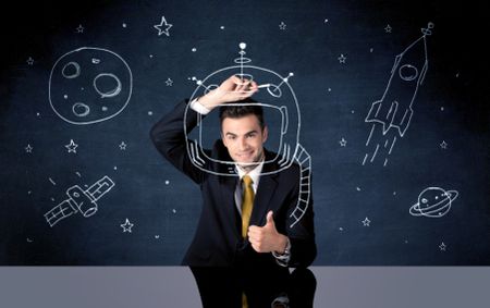 A young happy businessman in elegant suit drawing helmet, satellite and rocket in empty space with a chalk illustration concept