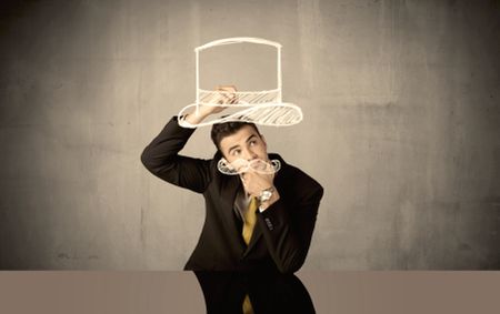 A young happy businessman in elegant suit drawing funny hat and mustache in empty grey space with a chalk illustration concept