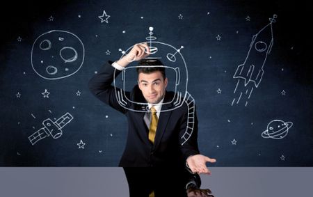 A young happy businessman in elegant suit drawing helmet, satellite and rocket in empty space with a chalk illustration concept