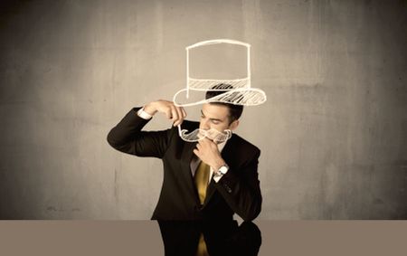 A young happy businessman in elegant suit drawing funny hat and mustache in empty grey space with a chalk illustration concept