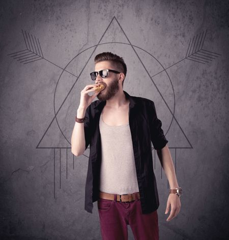 A young hipster male in modern clothes standing in front of an urban wall with modern sign illustration concept