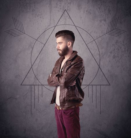 A young hipster male in modern clothes standing in front of an urban wall with modern sign illustration concept