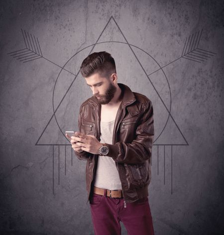 A young hipster male in modern clothes standing in front of an urban wall with modern sign illustration concept