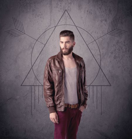 A young hipster male in modern clothes standing in front of an urban wall with modern sign illustration concept