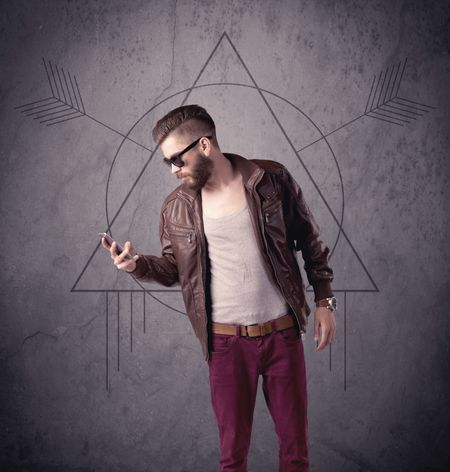 A young hipster male in modern clothes standing in front of an urban wall with modern sign illustration concept