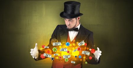 Young illusionist in tails hold between hands gambling staffs with super power