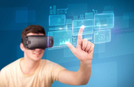 Young impressed man wearing virtual reality goggles with blue squares containing data at his fingers