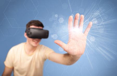 Young impressed man wearing virtual reality goggles with blue hexagons around him