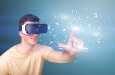 Young impressed man wearing virtual reality goggles with mixed media icons around his finger