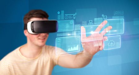 Young impressed man wearing virtual reality goggles with blue squares containing data at his fingers