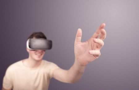 Young impressed man wearing virtual reality goggles