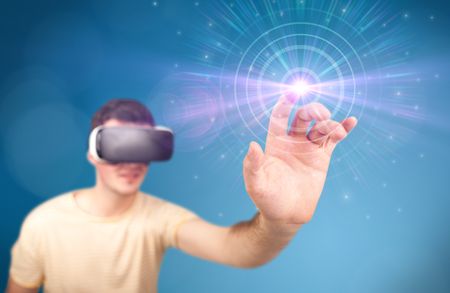 Young impressed man wearing virtual reality goggles with blue circles around his finger