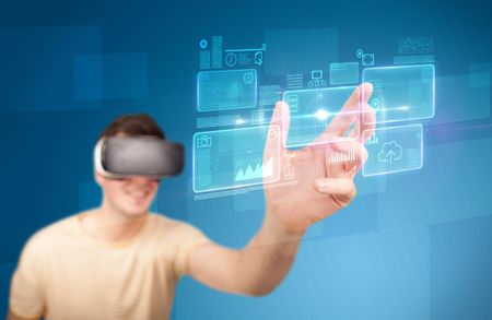 Young impressed man wearing virtual reality goggles with blue squares containing data at his fingers