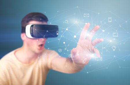 Young impressed man wearing virtual reality goggles with mixed media icons around his finger