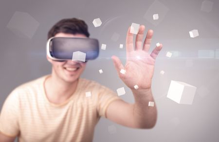 Young impressed man wearing virtual reality goggles with grey cubes around him