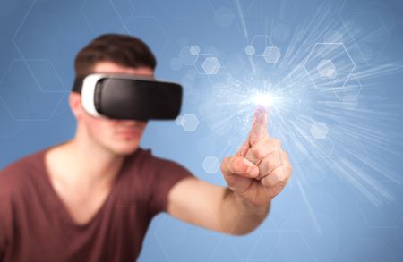 Young impressed man wearing virtual reality goggles with blue hexagons around him
