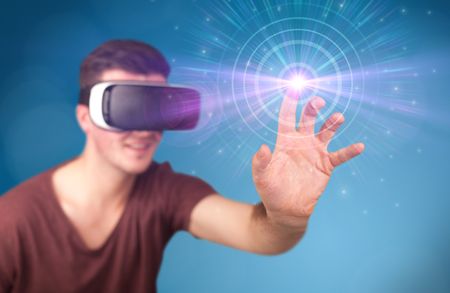 Young impressed man wearing virtual reality goggles with blue circles around his finger