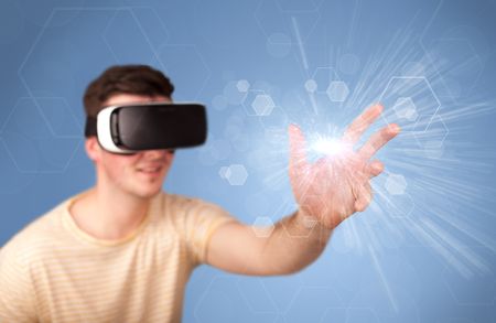 Young impressed man wearing virtual reality goggles with blue hexagons around him