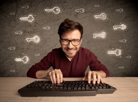 A young internet geek working online, hacking login passwords of social media users concept with glowing drawn keys on the wall