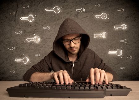 A young internet geek working online, hacking login passwords of social media users concept with glowing drawn keys on the wall