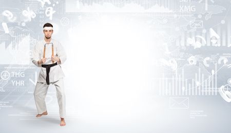 Young karate trainer doing karate tricks on the top of a metropolitan city