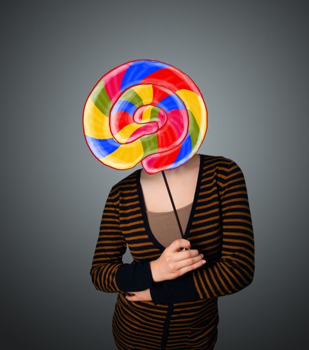 Young lady holding a colorful striped lollipop in front of her head