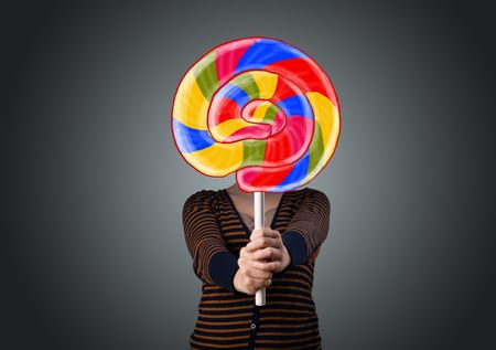 Young lady holding a colorful striped lollipop in front of her head