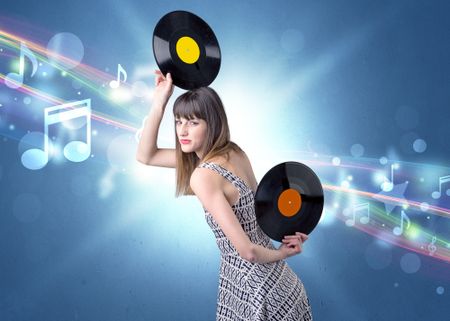 Young lady holding vinyl record on a blue background with musical notes behind her