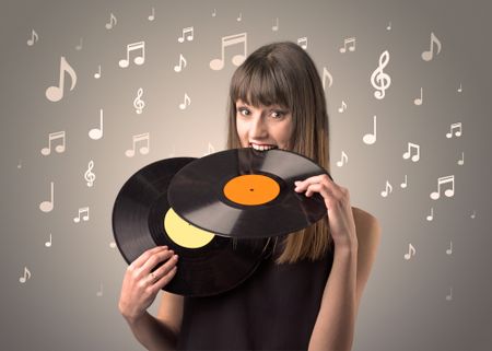 Young lady holding vinyl record on a brown background with musical notes behind her