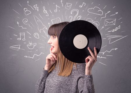 Young lady holding vinyl record on a grey background with mixed scribbles behind her