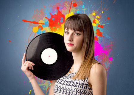 Young lady holding vinyl record on a grey background with colorful splashes behind her
