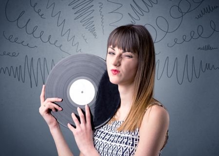 Young lady holding vinyl record on a grey background with scribbles around her