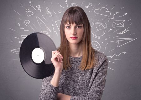 Young lady holding vinyl record on a grey background with mixed scribbles behind her