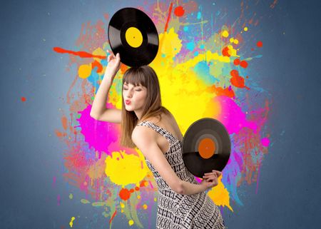 Young lady holding vinyl record on a grey background with colorful splashes behind her