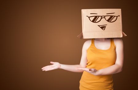 Young lady standing and gesturing with a cardboard box on her head with smiley face